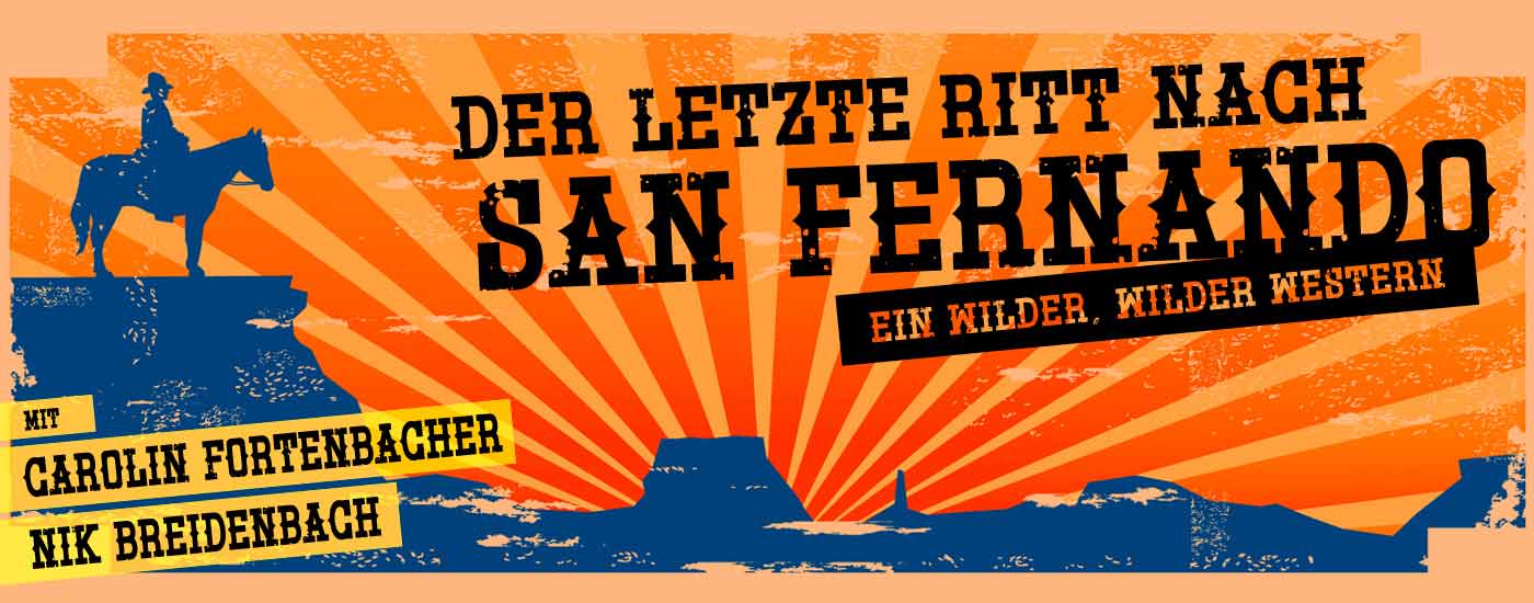 Nach den Erfolgen von „Oh Alpenglühn!“ und „Entführung aus dem Paradies“ drehen Carolin Fortenbacher und Nik Breidenbach in „Der letzte Ritt nach San Fernando“ jetzt das Western-Genre komplett auf links. Mit gut geölter Stimme, mindestens einer Hand am Colt und enorm viel Taktgefühl in den Beinen fackeln die beiden Lieblings-Rampensäue ein musikalisches und komödiantisches Feuerwerk ab, bis die Kojoten um die Wette pfeifen. Die Song-Spannbreite reicht von Truck Stop und Dolly Parton bis zu Britney Spears, Gitte und den Bee Gees, von „Cotton Eye Joe“ über „No Roots“ bis hin zu Musicalhits aus „Cats“ und „Jekyll & Hyde“. YEE-HAW!